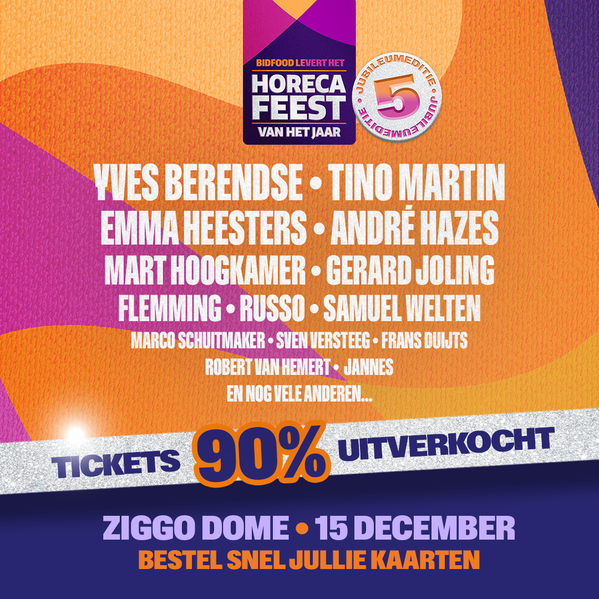 En dit jaar krijg je meer dan alleen tickets: scoor tickets op de eerste ring en maak kans op limited edition jubileum merchandise. Kies voor de tweede ring en krijg toegang tot de exclusieve Horecafeest Pre-Party!
