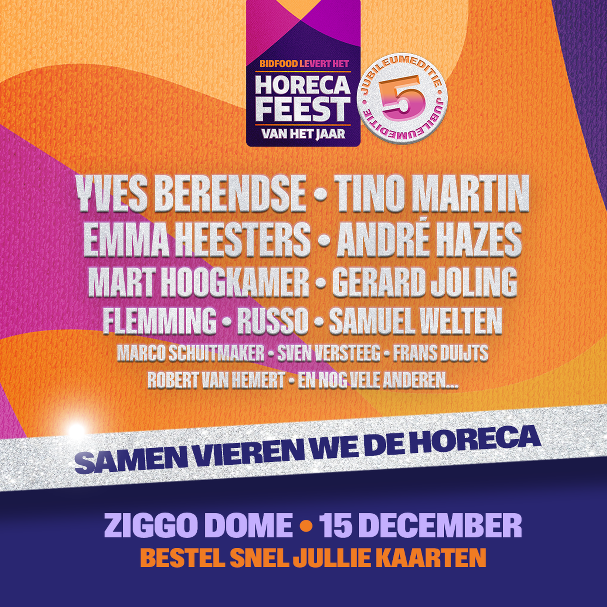 WAUW! Jullie enthousiasme is niet te stoppen. De Early Bird tickets voor het Horeca Feest van het Jaar zijn volledig uitverkocht! Maar… jullie kunnen er natuurlijk nog steeds bij zijn! De reguliere tickets zijn nu beschikbaar. Dit wordt dé jubileum editie vol glitter, top artiesten en bovenal: met elkaar! Jullie zijn de sterren. En dit is jullie avond! Zorg dat jullie erbij zijn en scoor de tickets nu voor 37,50.